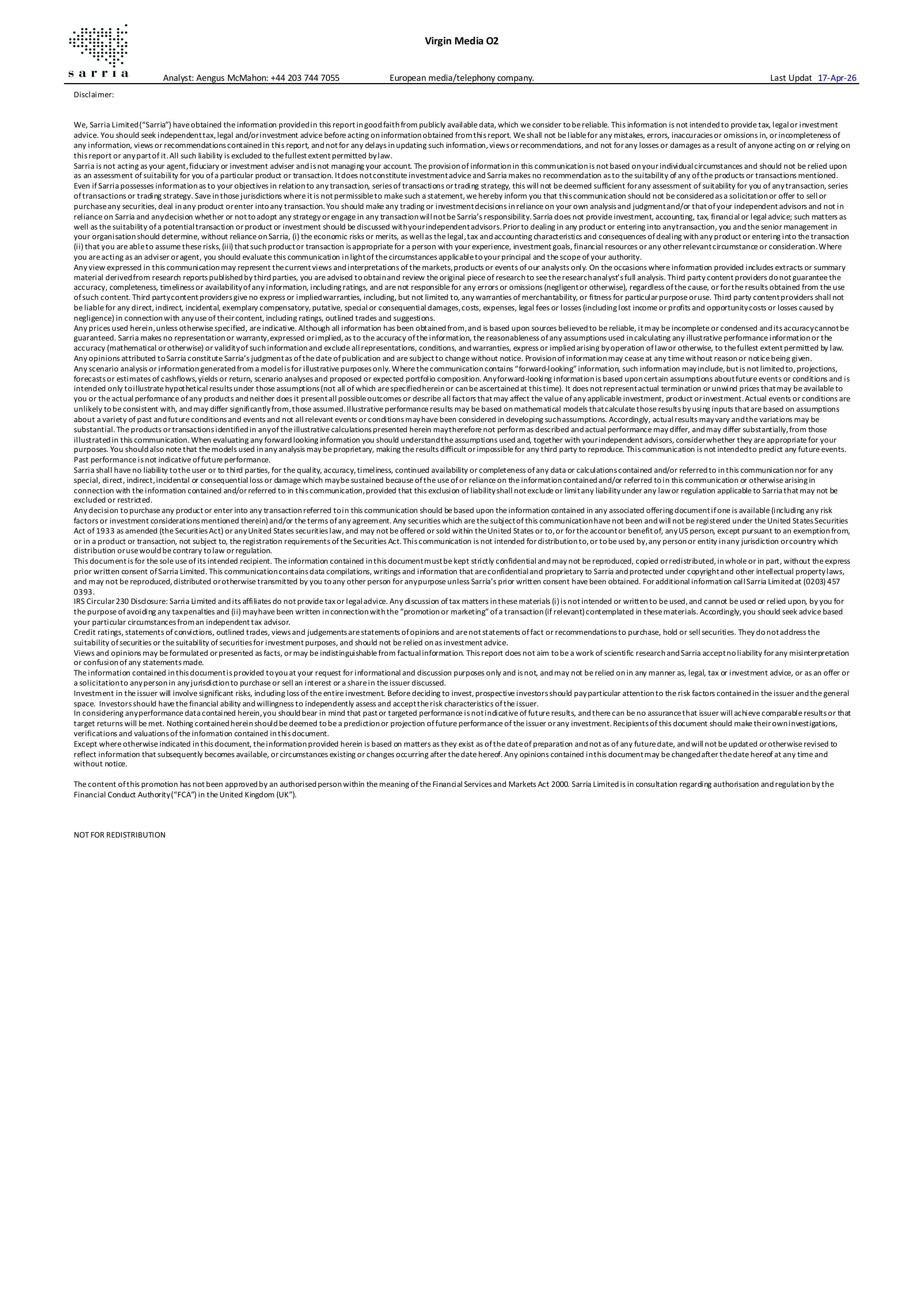 The impact on bondholders here is small, the leverage in the acquired asset is 5.5x (above the level at VMO2), but at <4% of the VMO2 debt stack, it is